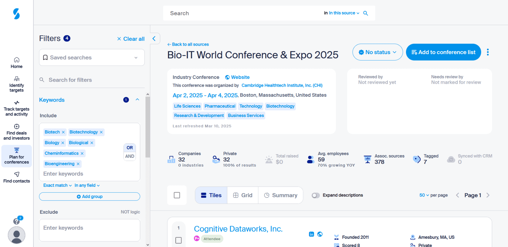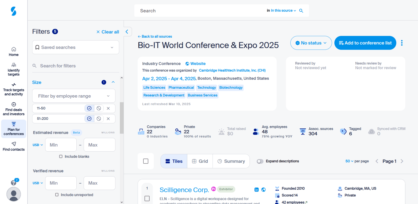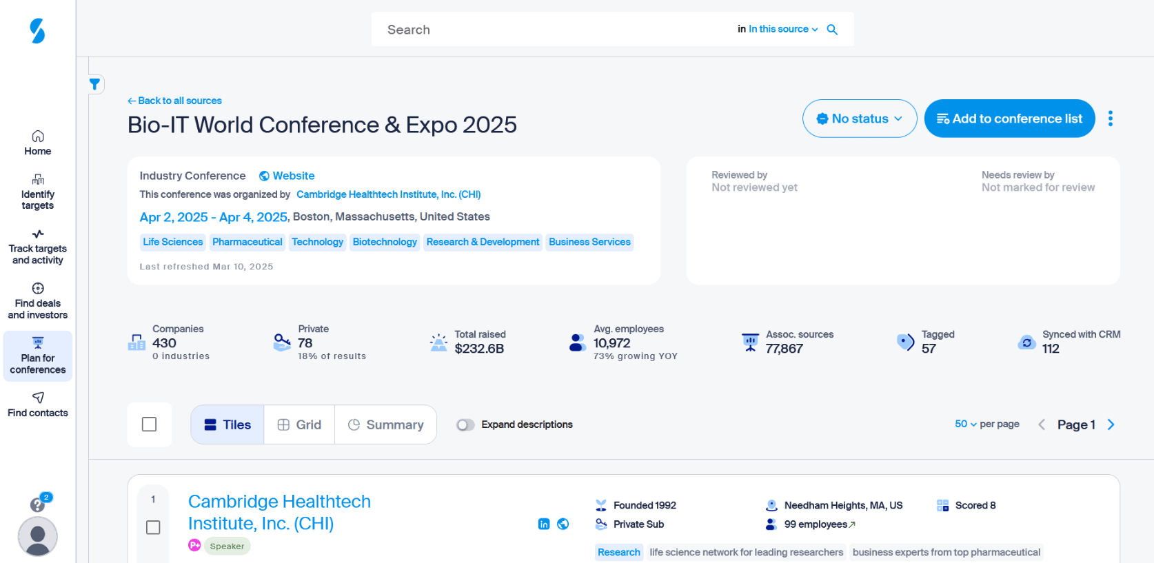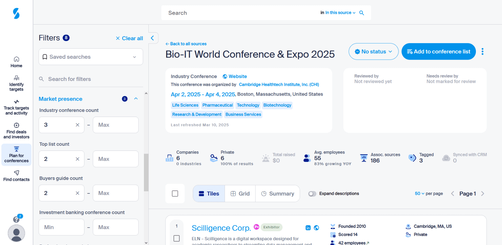 Now that you’ve narrowed down your trade show options, it’s time to start digging into each list to see which conferences offer the largest number of relevant targets. BIO-IT World Conference & Expo 2025 has over 400 companies planning to attend, plus we heard good things about last year’s event, so we decide to choose this list to investigate further.