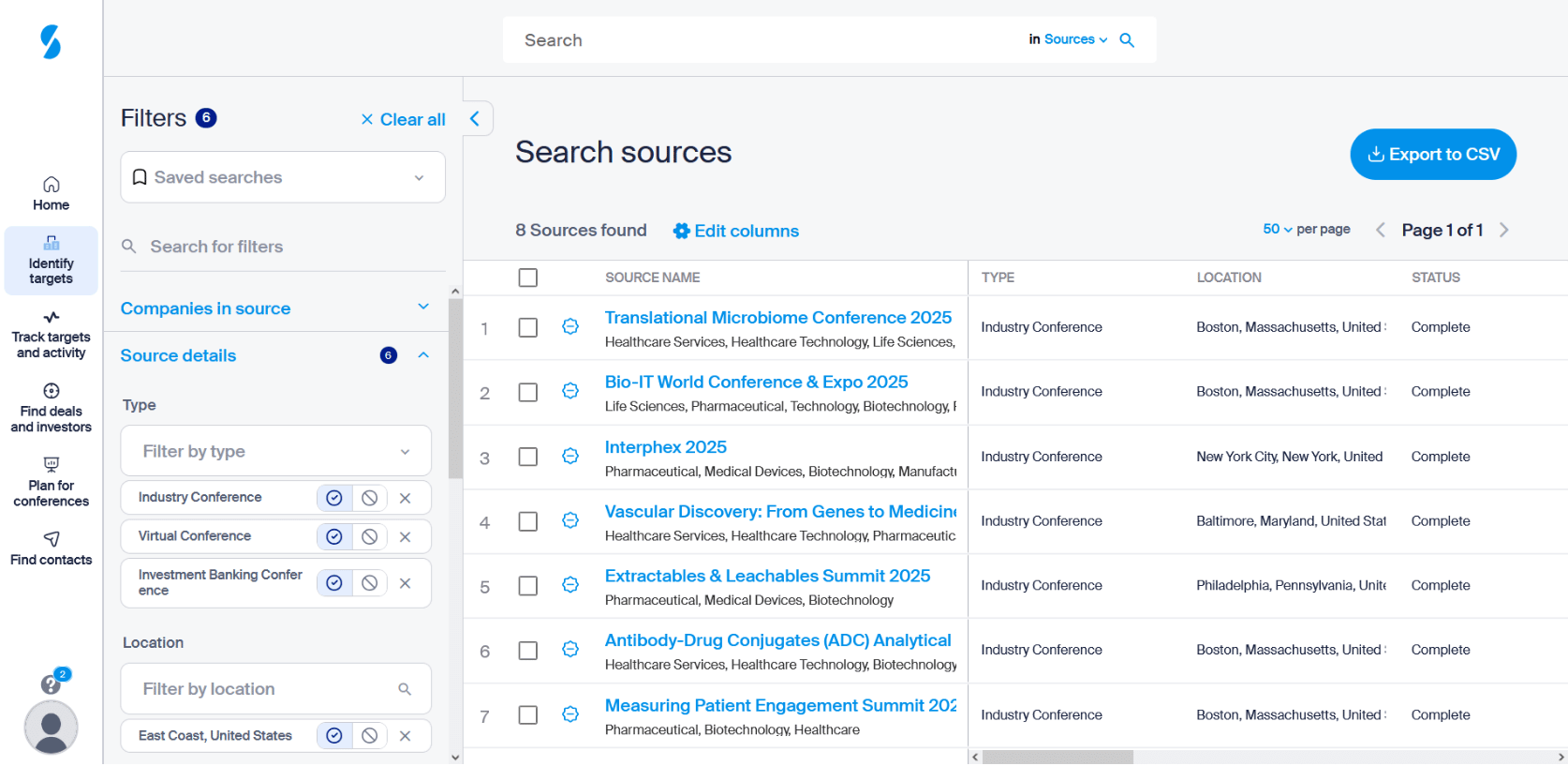 Next, filter these lists by the conference location, industry-focus, and timeline that fits your needs. Remember we are hoping to find East Coast-based, biotechnology-related events taking place within the next month.