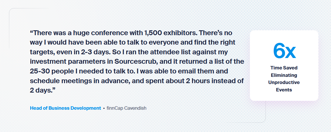 Firms like finnCap Cavendish use the time they save to focus on preparing to meet these companies in person and building human relationships with the opportunities that matter most. “If I were attending a conference of 500 businesses, it would take someone two days to manually research every company and know whether it’s a target,” shares finnCap Cavendish’s Head of Business Development, Jonny Burr.