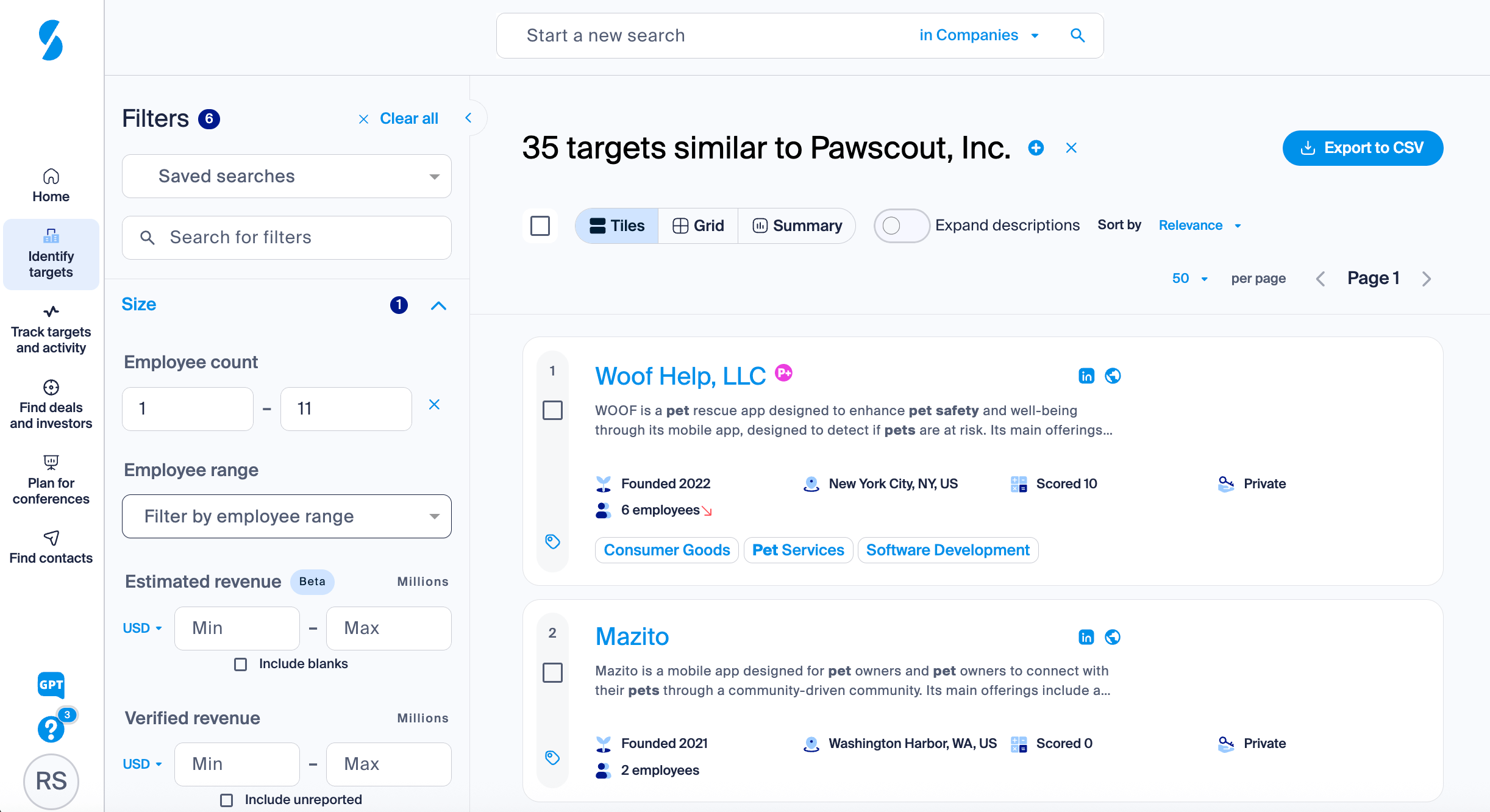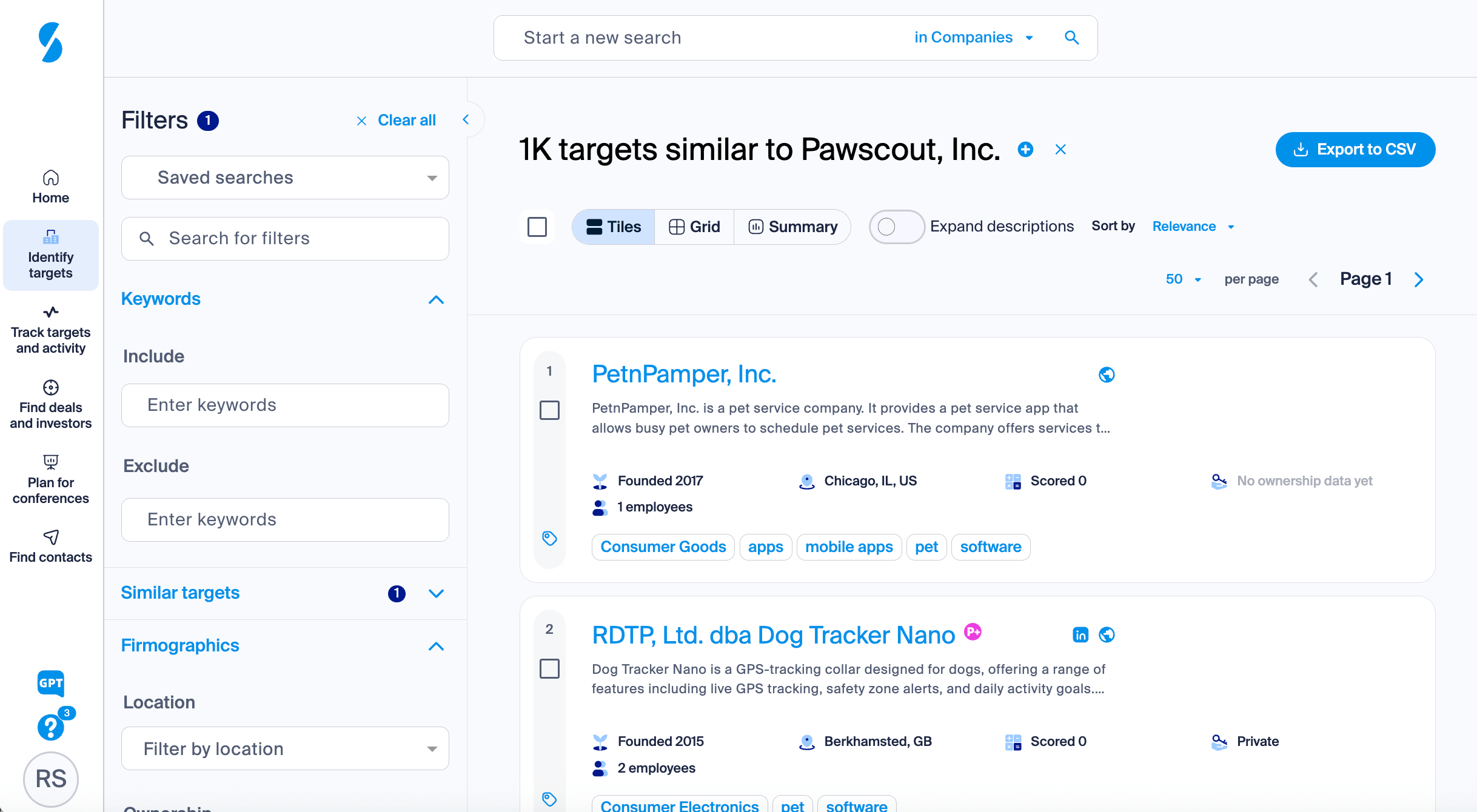 First, use your deal sourcing platform to find companies that are similar to your chosen platform company, or in our case, Pawscout.