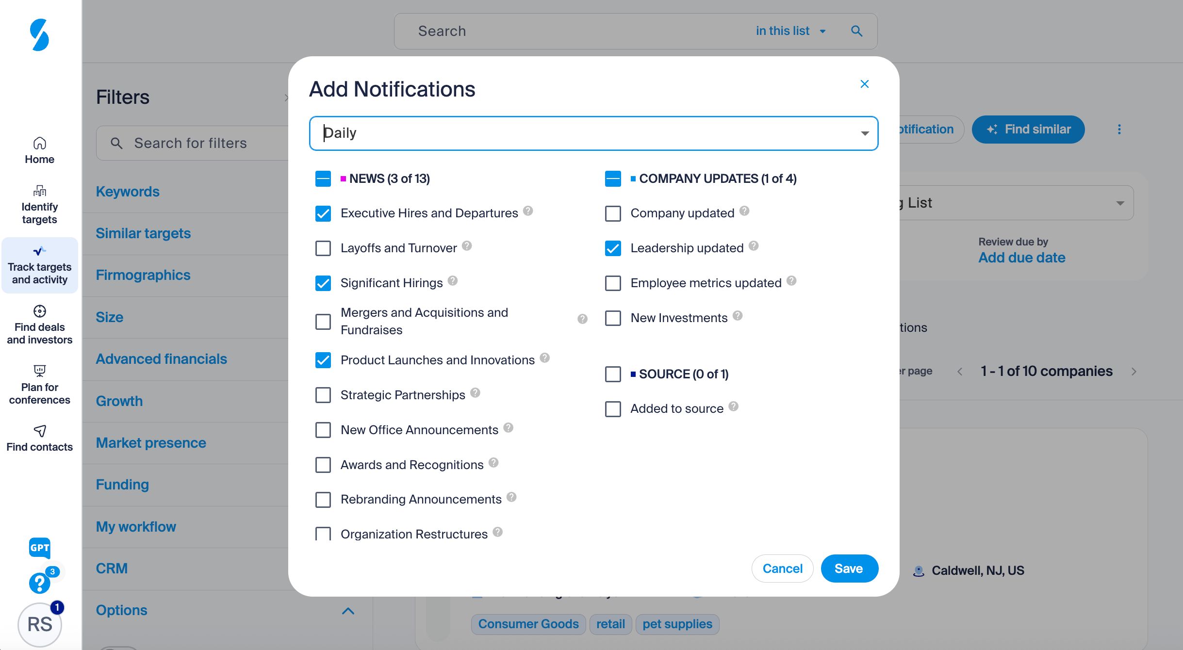 It’s useful to monitor top add-on targets for signs of investment readiness, as well as important news that may give your firm an excuse to continue to reach out and build rapport. After saving our list in Sourcescrub, we simply click “Add Notification” to select the signals we would like to monitor, and choose how often we would like to receive these notifications.