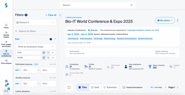 Now that you’ve narrowed down your trade show options, it’s time to start digging into each list to see which conferences offer the largest number of relevant targets. BIO-IT World Conference & Expo 2025 has over 400 companies planning to attend, plus we heard good things about last year’s event, so we decide to choose this list to investigate further.